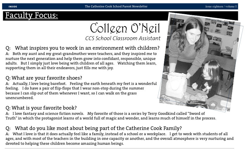 My niece, Colleen O’Neil, works at Catherine Cook School. She was featured in their newsletter last month. Here’s the interview: